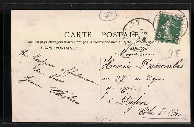 Personenbezogene Daten auf der Rückseite der Karte wurden durch blauen Textmarker unkenntlich gemacht. Die blauen Stellen sind auf die Vorderseite durchgeweicht und wirken sich negativ auf das Postkartenfoto aus