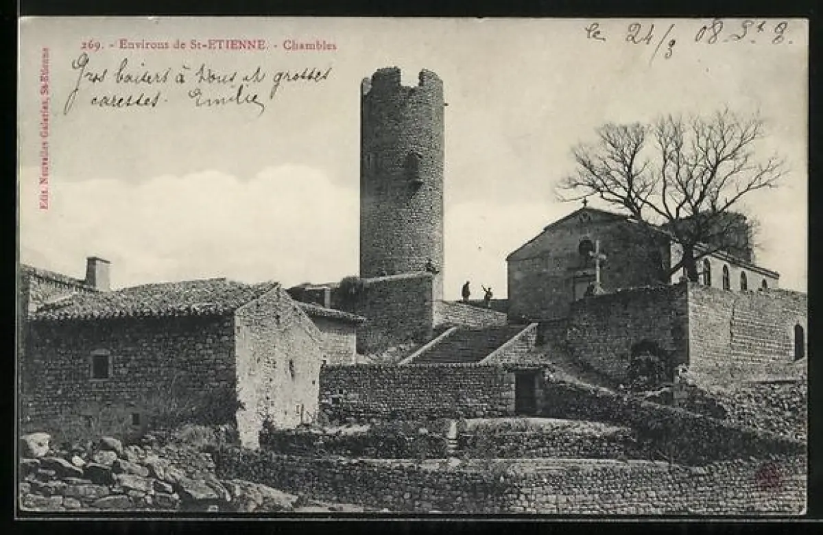 AK Chambles, Vue du château médiéval et de sa tour imposante