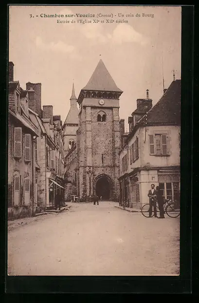 AK Chambon-sur-Voueize, Un coin du Bourg, Entrée de l`Eglise XIe et XIIe siècles