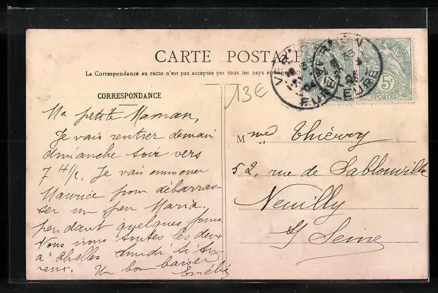 Personenbezogene Daten auf der Rückseite der Karte wurden durch blauen Textmarker unkenntlich gemacht. Die blauen Stellen sind auf die Vorderseite durchgeweicht und wirken sich negativ auf das Postkartenfoto aus
