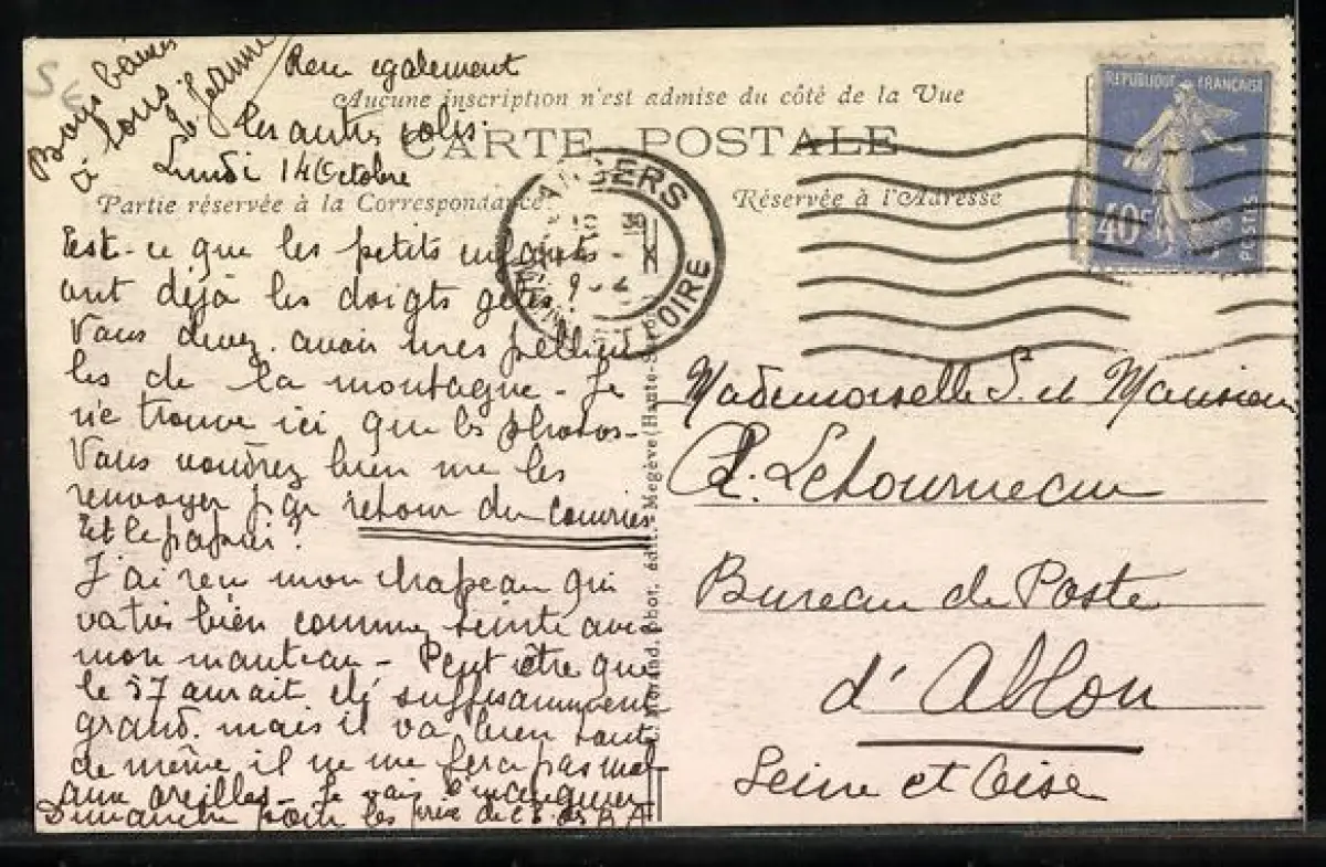 Personenbezogene Daten auf der Rückseite der Karte wurden durch blauen Textmarker unkenntlich gemacht. Die blauen Stellen sind auf die Vorderseite durchgeweicht und wirken sich negativ auf das Postkartenfoto aus
