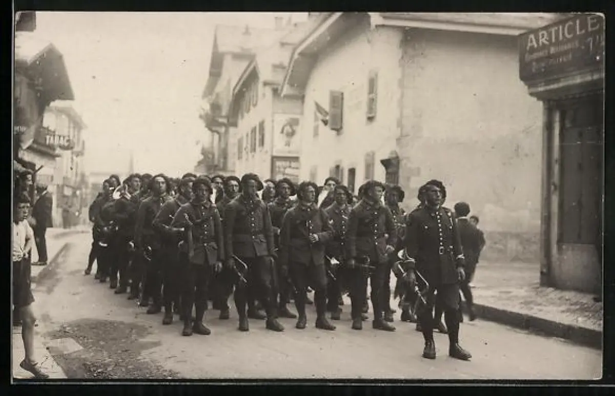 AK Chamonix, Französische Alpenjäger auf Marsch durch Chamonix