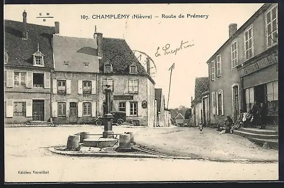 AK Champlemy, Route de Prémery avec fontaine et maisons anciennes