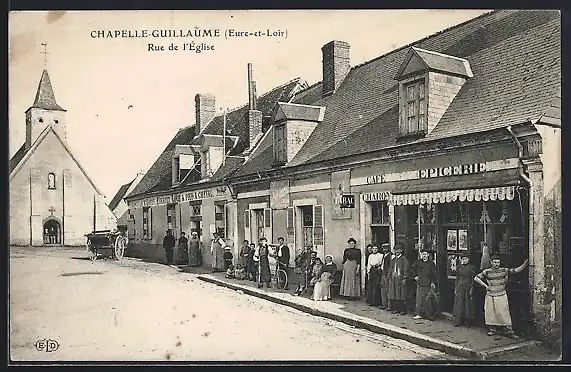 AK Chapelle-Guillaume, Rue de l`Église avec des habitants devant les commerces et l`église à l`arrière-plan