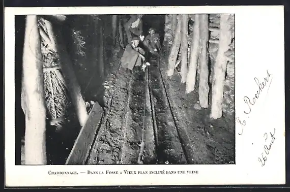 AK Charbonnage, Dans la Fosse, Vieux plan incliné dans une veine, Bergarbeiter im Kohlebergwerk