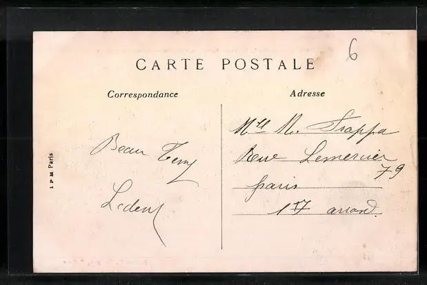 Personenbezogene Daten auf der Rückseite der Karte wurden durch blauen Textmarker unkenntlich gemacht. Die blauen Stellen sind auf die Vorderseite durchgeweicht und wirken sich negativ auf das Postkartenfoto aus