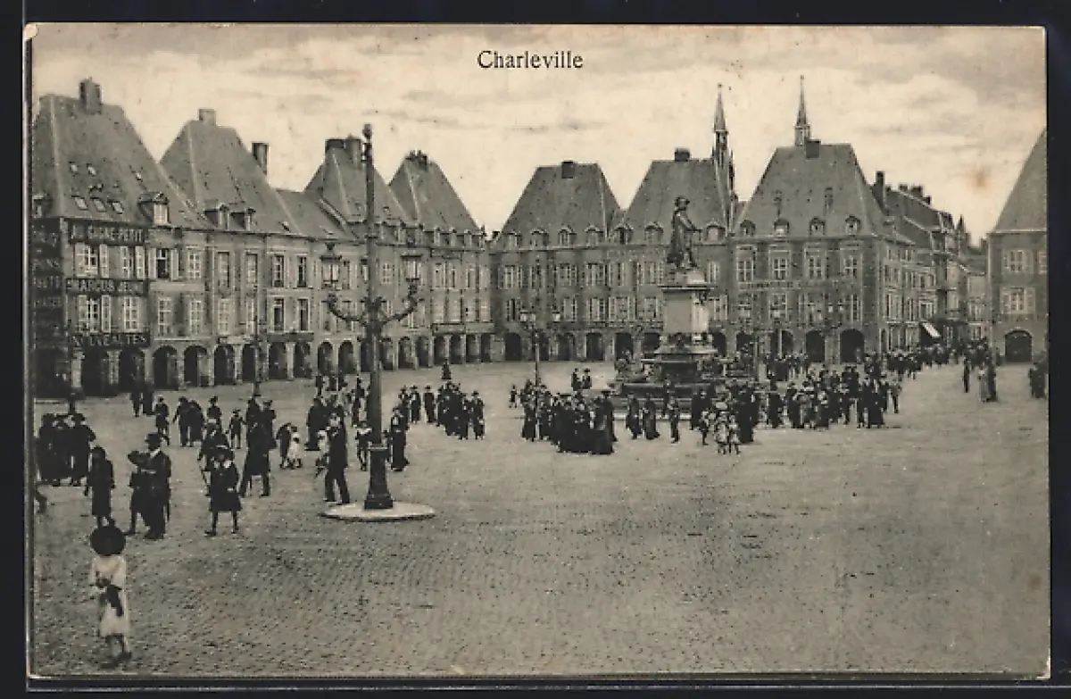 AK Charleville, Place animée avec fontaine et bâtiments anciens