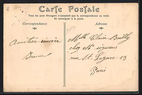 Personenbezogene Daten auf der Rückseite der Karte wurden durch blauen Textmarker unkenntlich gemacht. Die blauen Stellen sind auf die Vorderseite durchgeweicht und wirken sich negativ auf das Postkartenfoto aus
