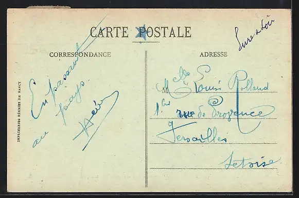 Personenbezogene Daten auf der Rückseite der Karte wurden durch blauen Textmarker unkenntlich gemacht. Die blauen Stellen sind auf die Vorderseite durchgeweicht und wirken sich negativ auf das Postkartenfoto aus