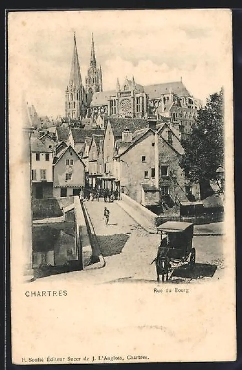 AK Chartres, Rue du Bourg avec vue sur la cathédrale et charrette à cheval