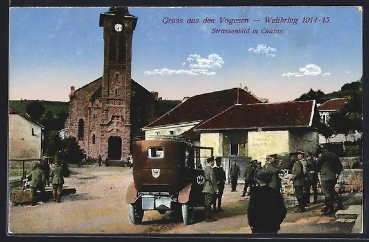 AK Chatas, Scène de rue avec église et soldats pendant la guerre mondiale 1914-15