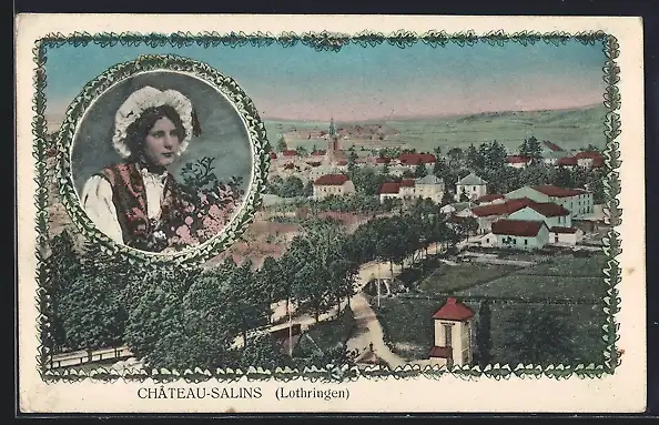 AK Chateau-Salins /Lothringen, Ortsansicht mit der Kirche, eine Frau mit Blumenstrauss