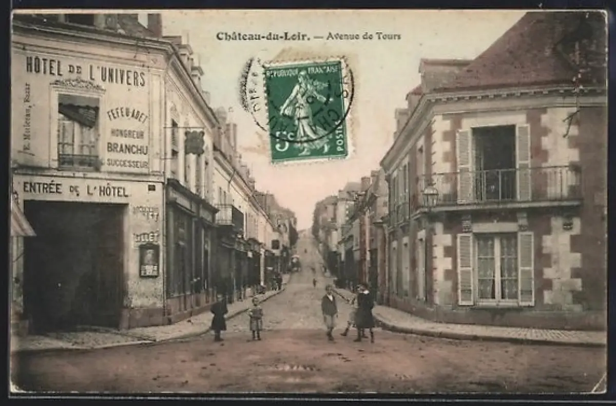 AK Château-du-Loir, Avenue de Tours avec l`Hôtel de l`Univers et passants dans la rue animée