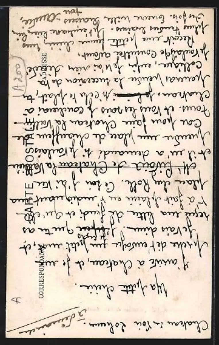 Personenbezogene Daten auf der Rückseite der Karte wurden durch blauen Textmarker unkenntlich gemacht. Die blauen Stellen sind auf die Vorderseite durchgeweicht und wirken sich negativ auf das Postkartenfoto aus