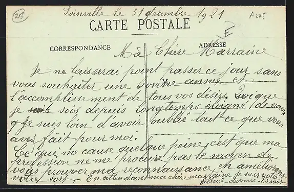 Personenbezogene Daten auf der Rückseite der Karte wurden durch blauen Textmarker unkenntlich gemacht. Die blauen Stellen sind auf die Vorderseite durchgeweicht und wirken sich negativ auf das Postkartenfoto aus