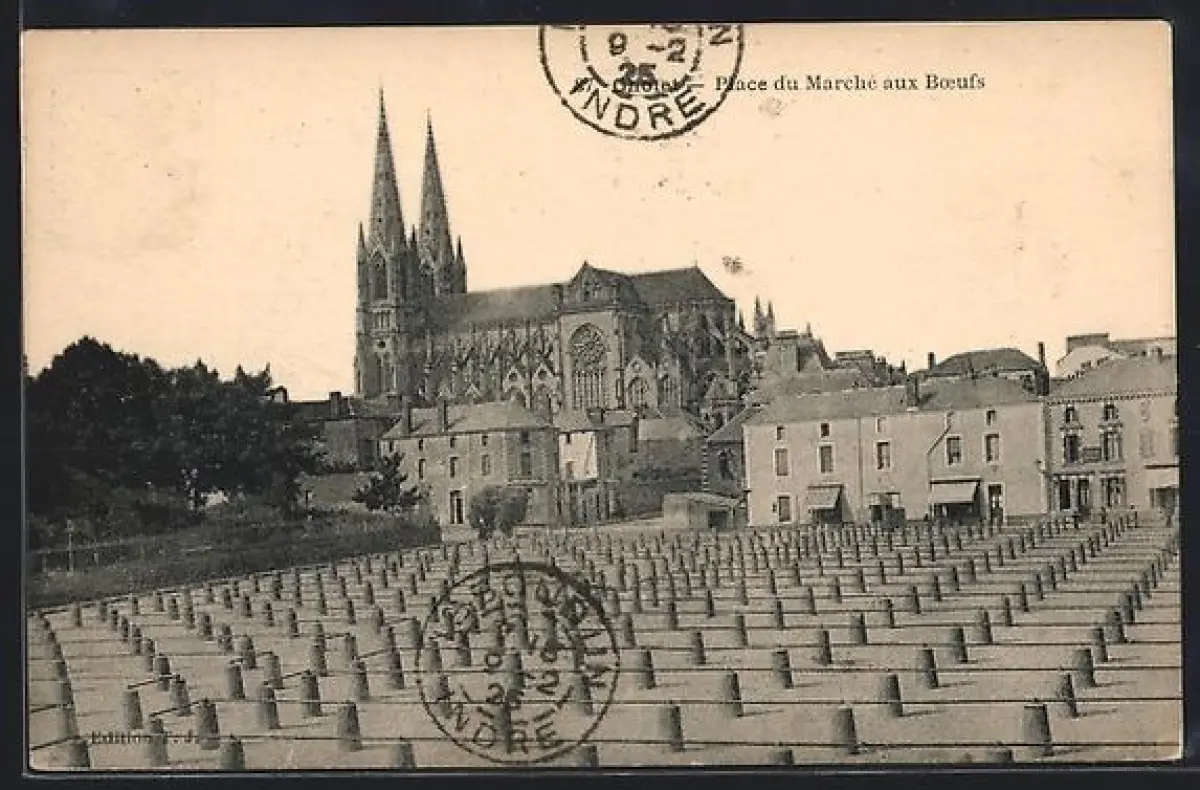 AK Châteauroux, Place du Marché aux Boeufs avec vue sur l`église en arrière-plan