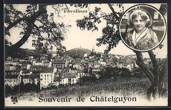 AK Châtelguyon, Souvenir avec vue sur la ville et portrait d`une jeune fille