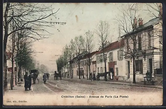 AK Châtillon, Avenue de Paris, La Poste, avec calèches et passants