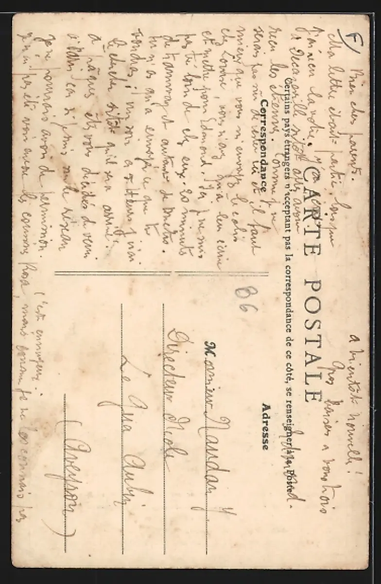 Personenbezogene Daten auf der Rückseite der Karte wurden durch blauen Textmarker unkenntlich gemacht. Die blauen Stellen sind auf die Vorderseite durchgeweicht und wirken sich negativ auf das Postkartenfoto aus