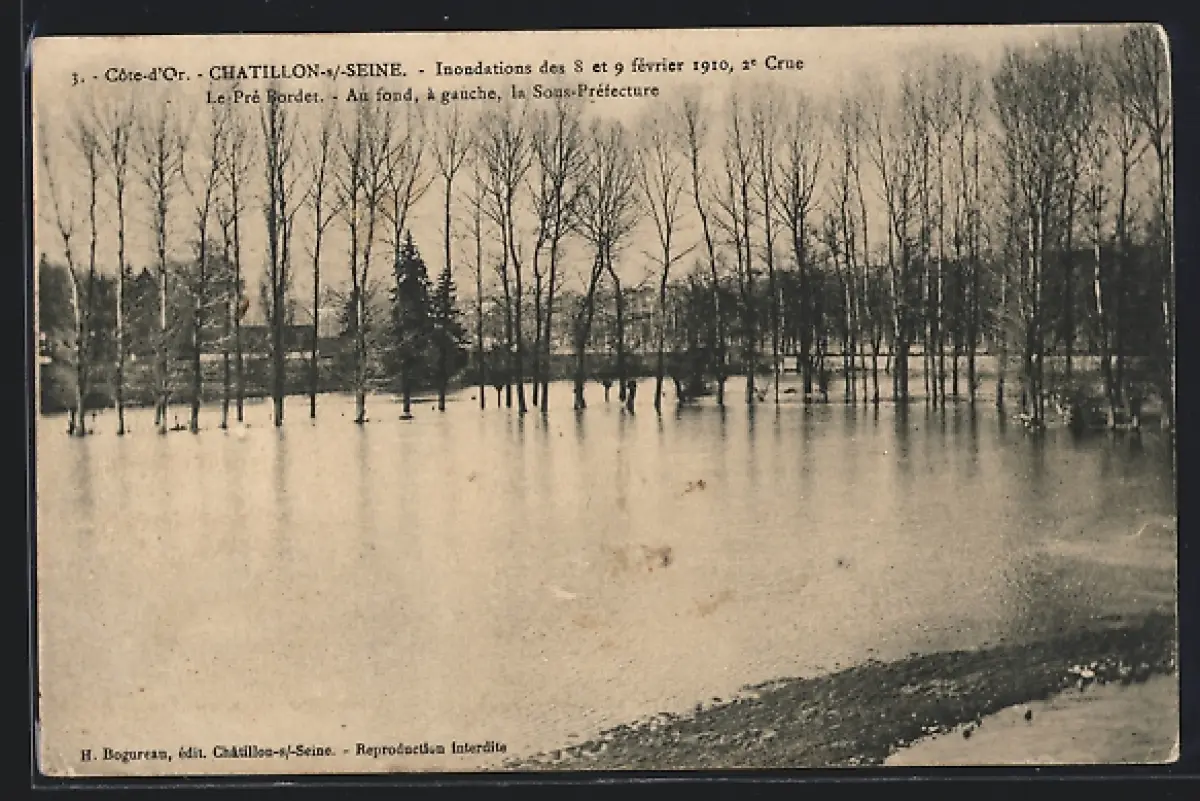 AK Chatillon-s-Seine /Côte-d`Or, Inondations de 1910, 2e Crue, Le Pré Bordet, Au fond, à gauche, la Sous-Préfecture