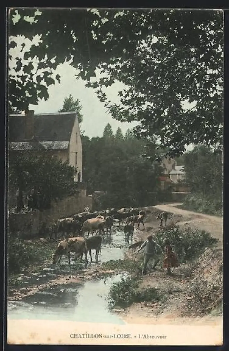 AK Châtillon-sur-Loire, L`Abreuvoir avec des vaches et un chemin bordé d`arbres
