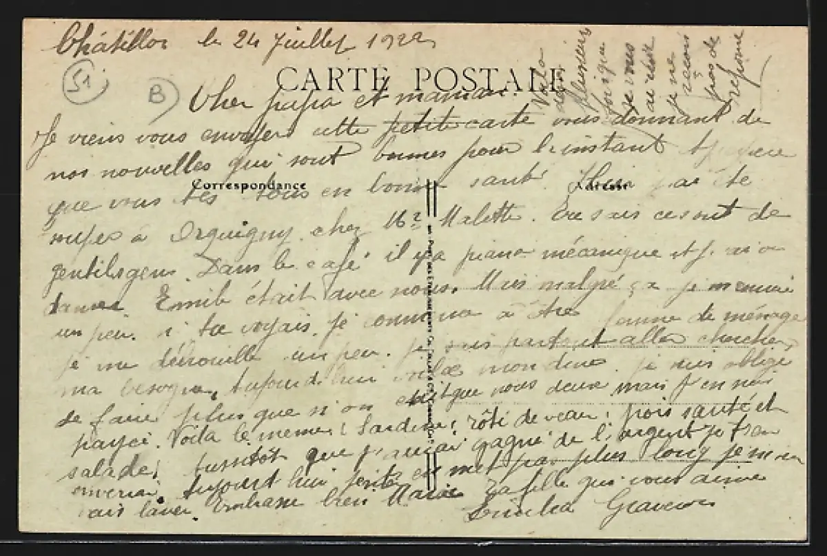 Personenbezogene Daten auf der Rückseite der Karte wurden durch blauen Textmarker unkenntlich gemacht. Die blauen Stellen sind auf die Vorderseite durchgeweicht und wirken sich negativ auf das Postkartenfoto aus