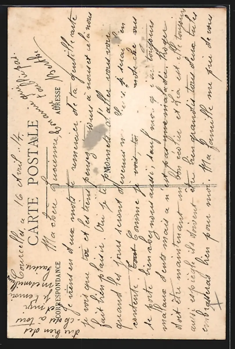Personenbezogene Daten auf der Rückseite der Karte wurden durch blauen Textmarker unkenntlich gemacht. Die blauen Stellen sind auf die Vorderseite durchgeweicht und wirken sich negativ auf das Postkartenfoto aus