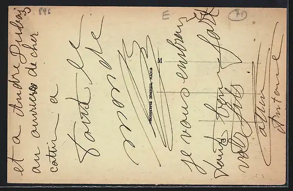 Personenbezogene Daten auf der Rückseite der Karte wurden durch blauen Textmarker unkenntlich gemacht. Die blauen Stellen sind auf die Vorderseite durchgeweicht und wirken sich negativ auf das Postkartenfoto aus