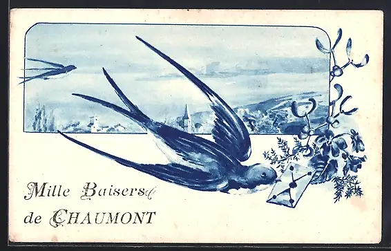 AK Chaumont, Mille baisers avec une hirondelle et vue du village
