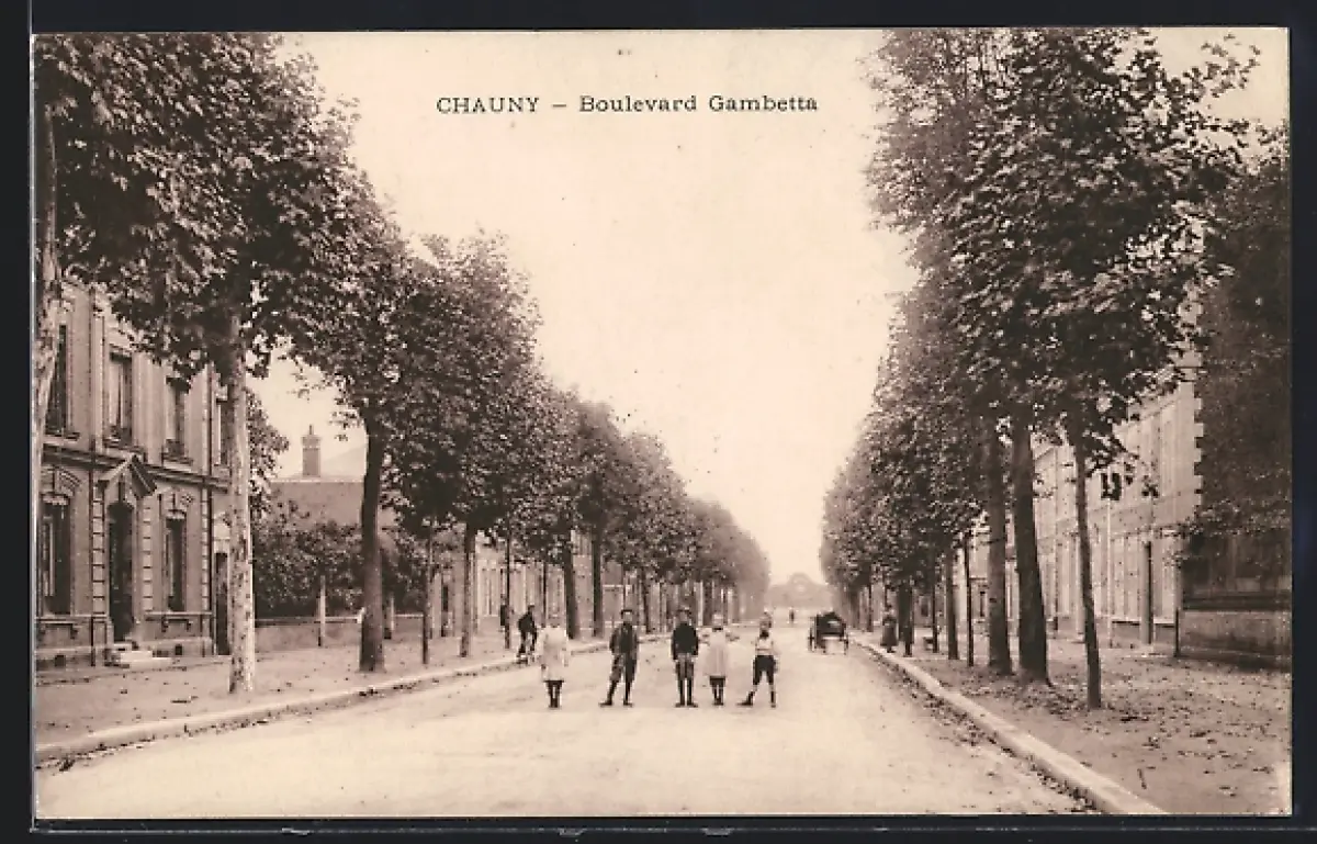 AK Chauny, Boulevard Gambetta avec enfants jouant dans l`allée arborée