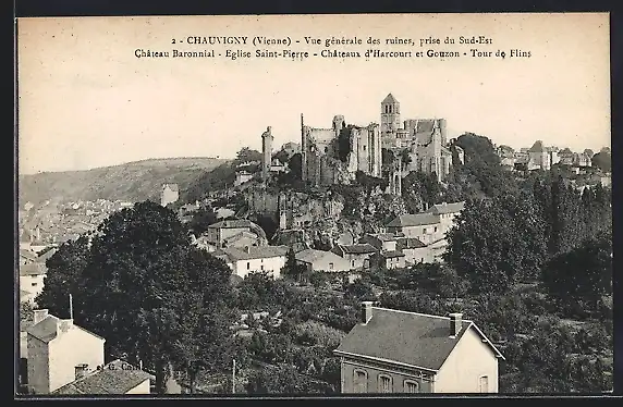 AK Chauvigny, Vue générale des ruines du Sud-Est avec Château Baronial et Église Saint-Pierre