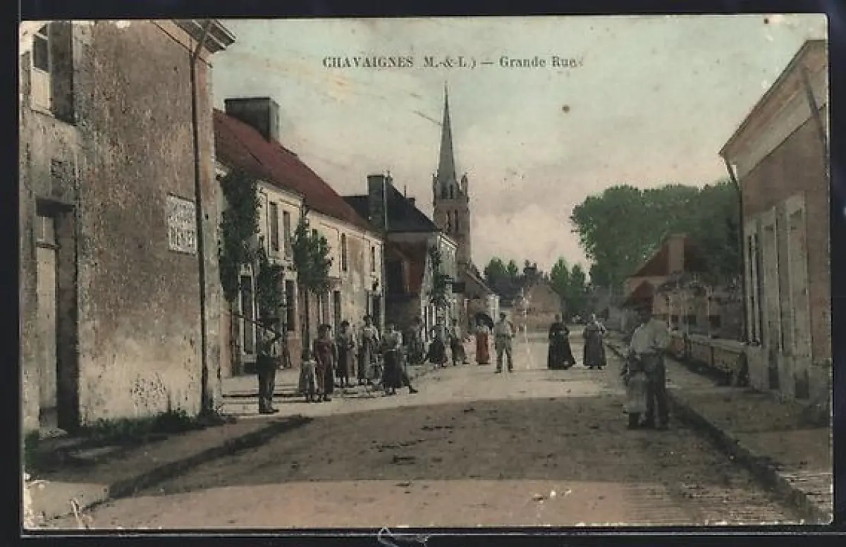 AK Chavagnes /M.-et-L., Grande Rue animée avec habitants et église au fond