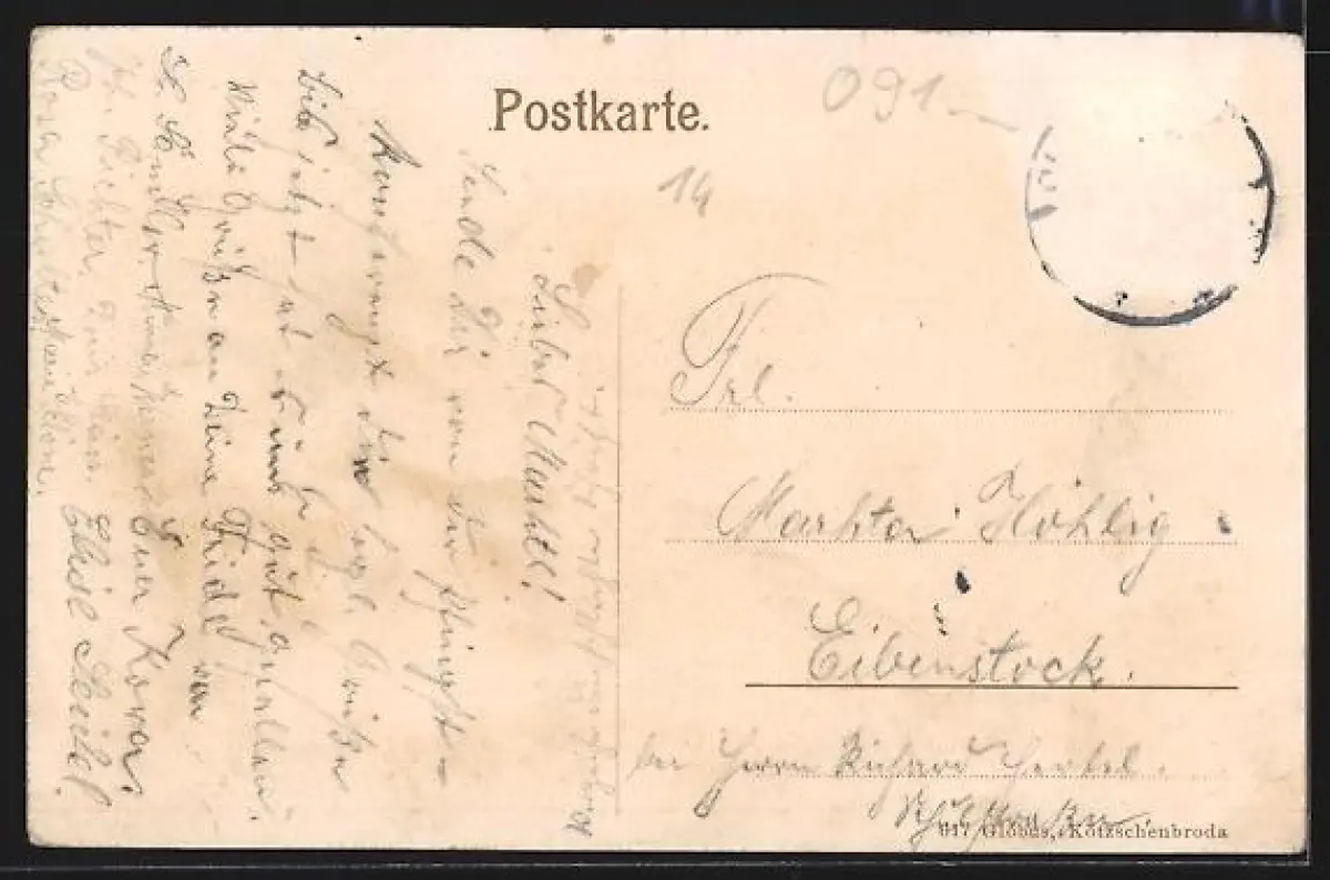 alte Ansichtskarte, gelaufen, Briefmarke entfernt, rückseitig Oberflächenschaden, Eckknick unten links, Stempelspur, guter Zustand
