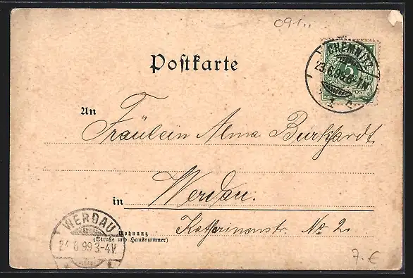 gelaufen 1899, Eckknicke re. unten u. li., guter Zustand