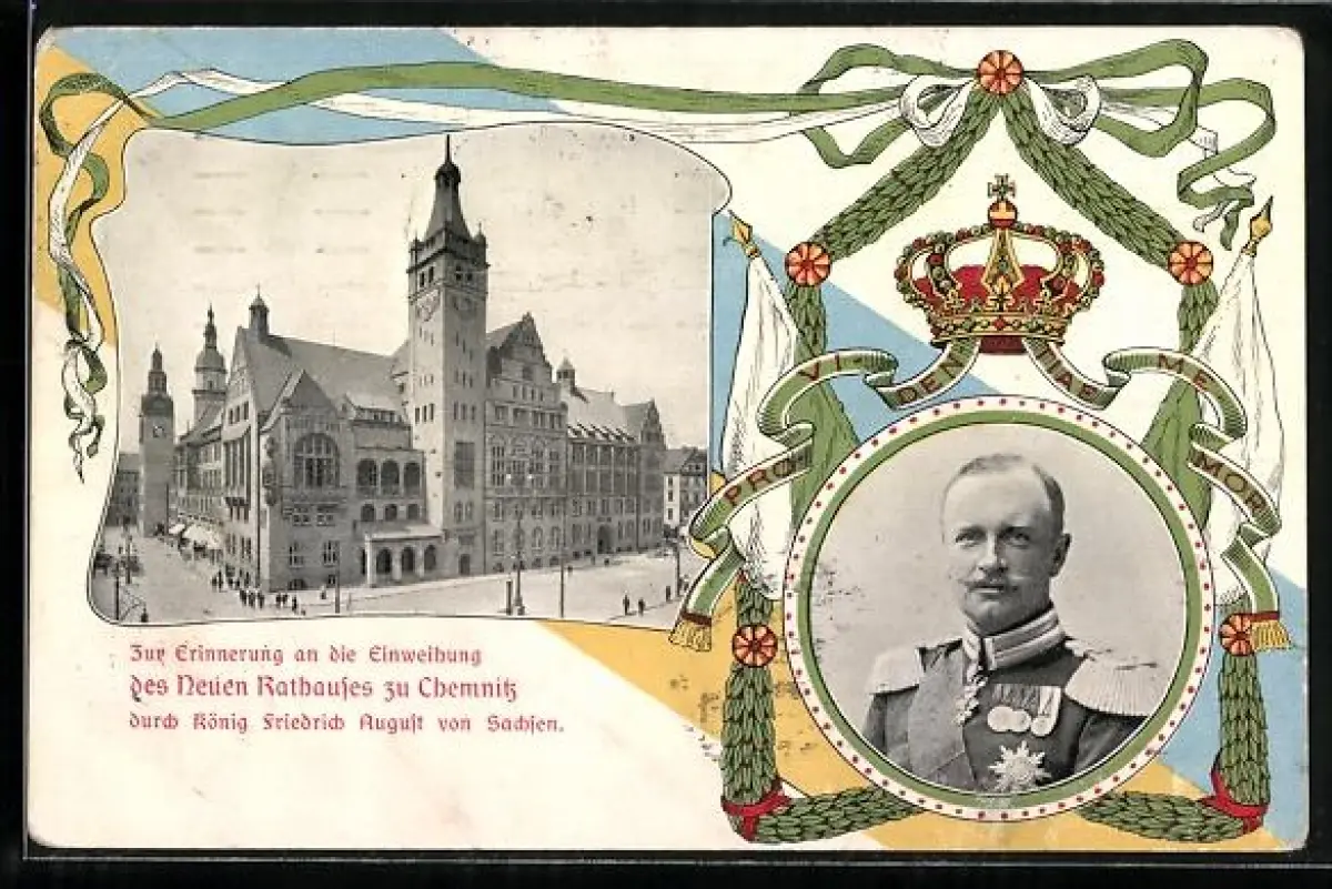 AK Chemnitz, Neues Rathaus, Portrait von König Friedrich August von Sachsen