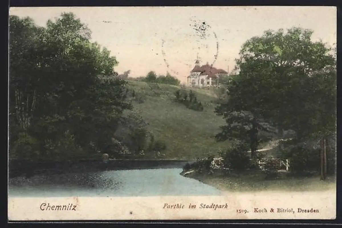 AK Chemnitz, Partie im Stadtpark mit Turmgebäude
