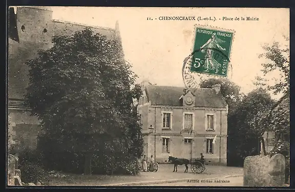 AK Chenonceaux, Place de la Mairie avec calèche et arbres environnants