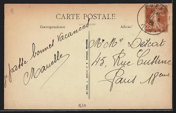 Personenbezogene Daten auf der Rückseite der Karte wurden durch blauen Textmarker unkenntlich gemacht. Die blauen Stellen sind auf die Vorderseite durchgeweicht und wirken sich negativ auf das Postkartenfoto aus