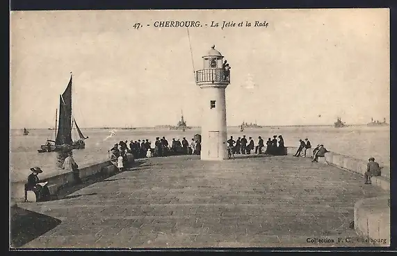 AK Cherbourg, La Jetee et la Rade, Segelboot & Leuchtturm