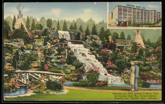 AK Chicago, IL, Waterfall and Rock Gardens in Olson Park, surrounding Olson Rug Company, Crawford and Diversey Ave.
