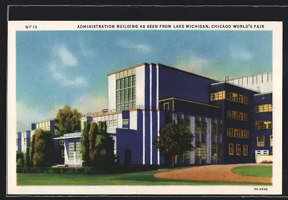 AK Chicago, World`s Fair 1933, Administration Building as seen from Lake Michigan, Ausstellung