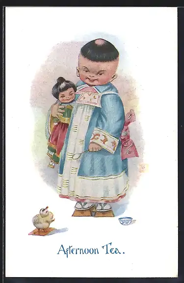 AK China, kleines chinesisches Mädchen mit Puppe im Arm mit Küken, Afternoon Tea