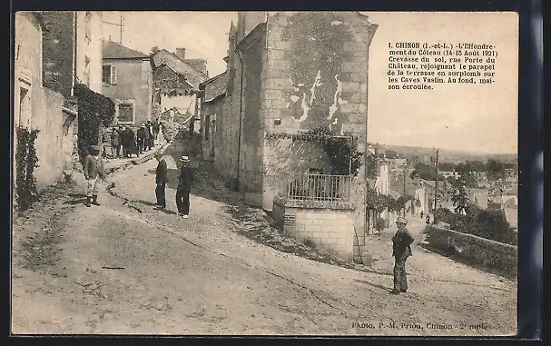 AK Chinon, Effondrement du clocher et vue des maisons endommagées dans la rue en pente