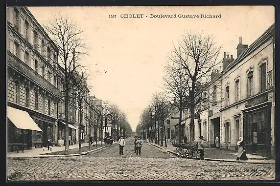 AK Cholet, Boulevard Gustave Richard avec passants et charrette
