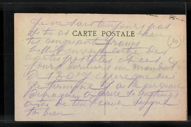 Personenbezogene Daten auf der Rückseite der Karte wurden durch blauen Textmarker unkenntlich gemacht. Die blauen Stellen sind auf die Vorderseite durchgeweicht und wirken sich negativ auf das Postkartenfoto aus