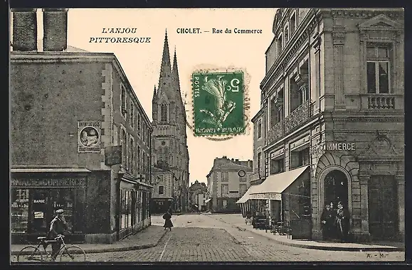AK Cholet, Rue du Commerce avec vue sur l`église et cycliste en premier plan