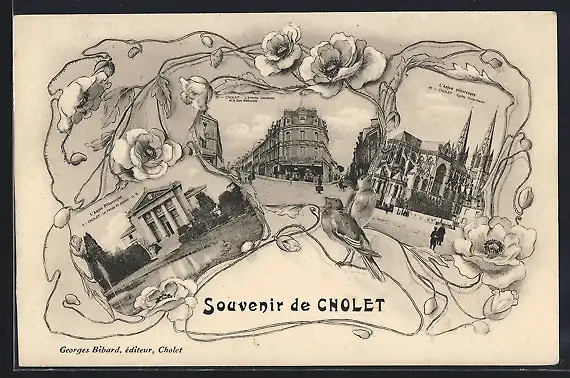 AK Cholet, Souvenir avec vues de la Place Travot et l`église Notre-Dame