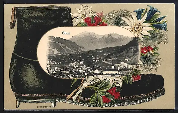 AK Chur, Totalansicht, Passepartout mit Wanderstiefel und Alpenblumen