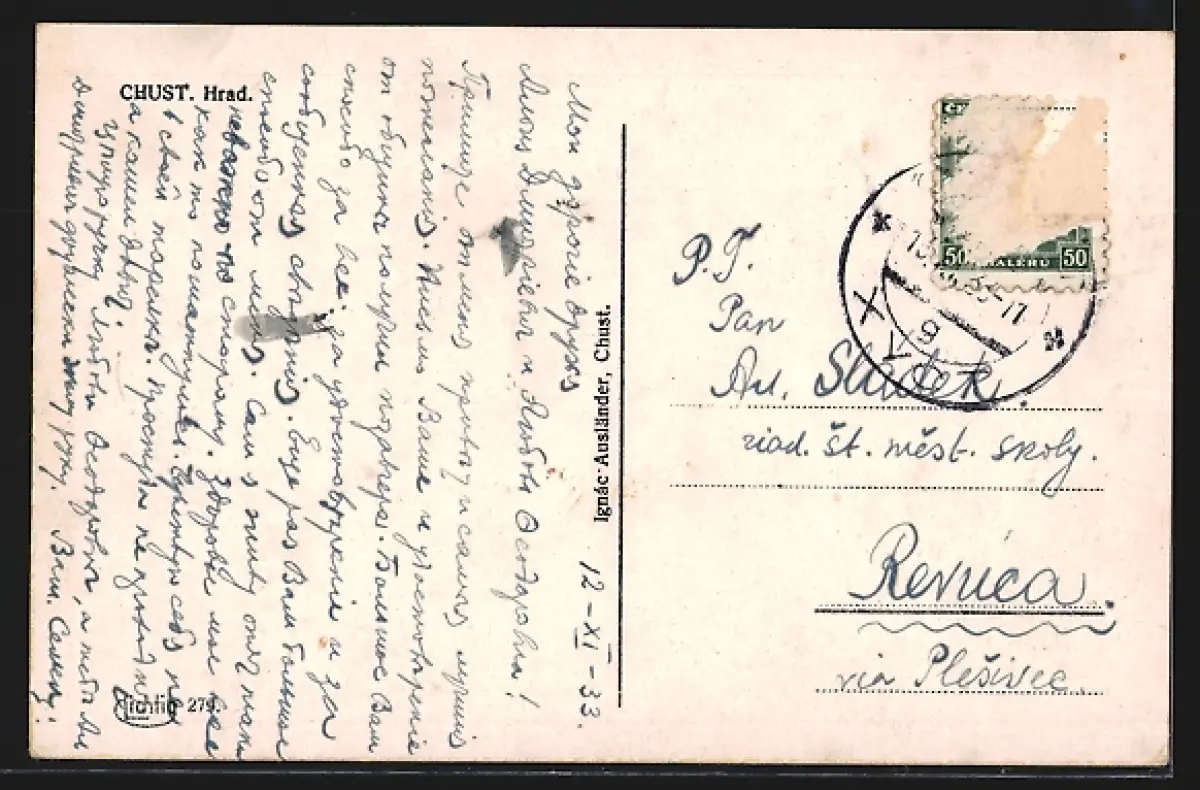 Personenbezogene Daten auf der Rückseite der Karte wurden durch blauen Textmarker unkenntlich gemacht. Die blauen Stellen sind auf die Vorderseite durchgeweicht und wirken sich negativ auf das Postkartenfoto aus