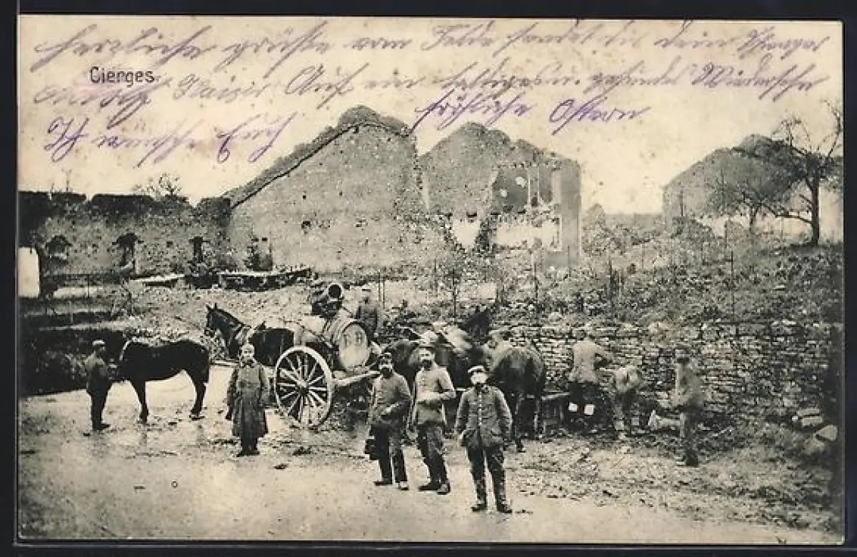 AK Cierges, Scène avec soldats et chevaux devant des ruines